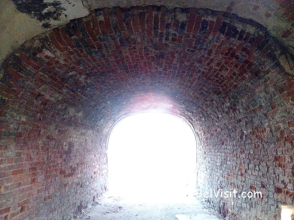 Трудно назвать этот вход в другой мир воротами в привычном понимании этого слова, скорее, он больше напоминает галерею или тоннель. Однако для построек тех лет крепостные ворота, видимо, должны были выглядеть именно так. Вход через них на территорию крепости давно заварен решеткой, но она нам не помеха, и мы обходим, а точнее, перелезаем преграду через забор на верху земляной насыпи 🙂