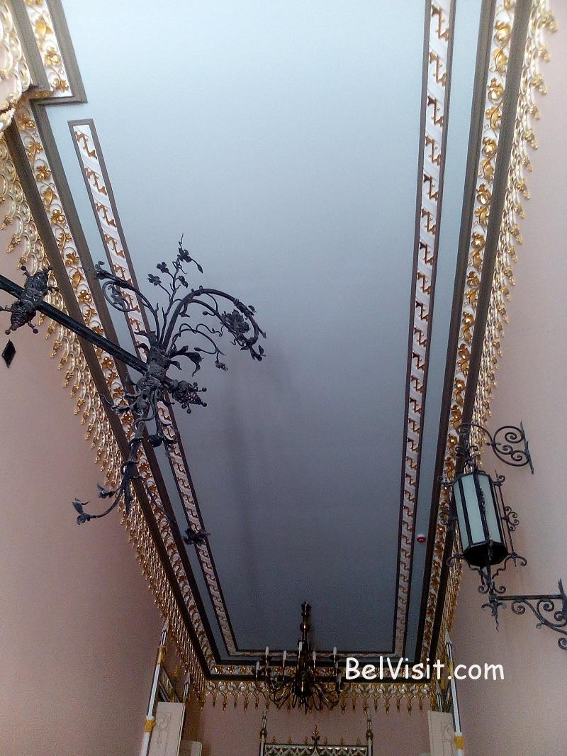 Когда будете гулять по комнатам, смотрите на потолки – настоящие произведения искусства! На лестнице между этажами их когда-то украшало сусальное золото. Конечно, сейчас это просто стилизованная краска, но смотрится очень эффектно. Особенно мне понравились гигантские подсвечники под потолком. К ним еще приделано что-то вроде ручки, чтобы их вращать, опускать и поднимать.